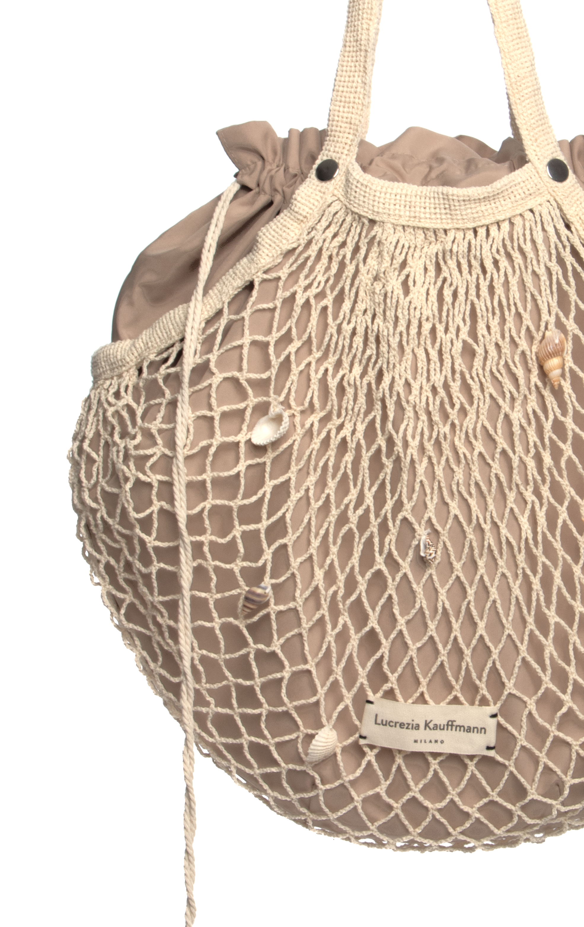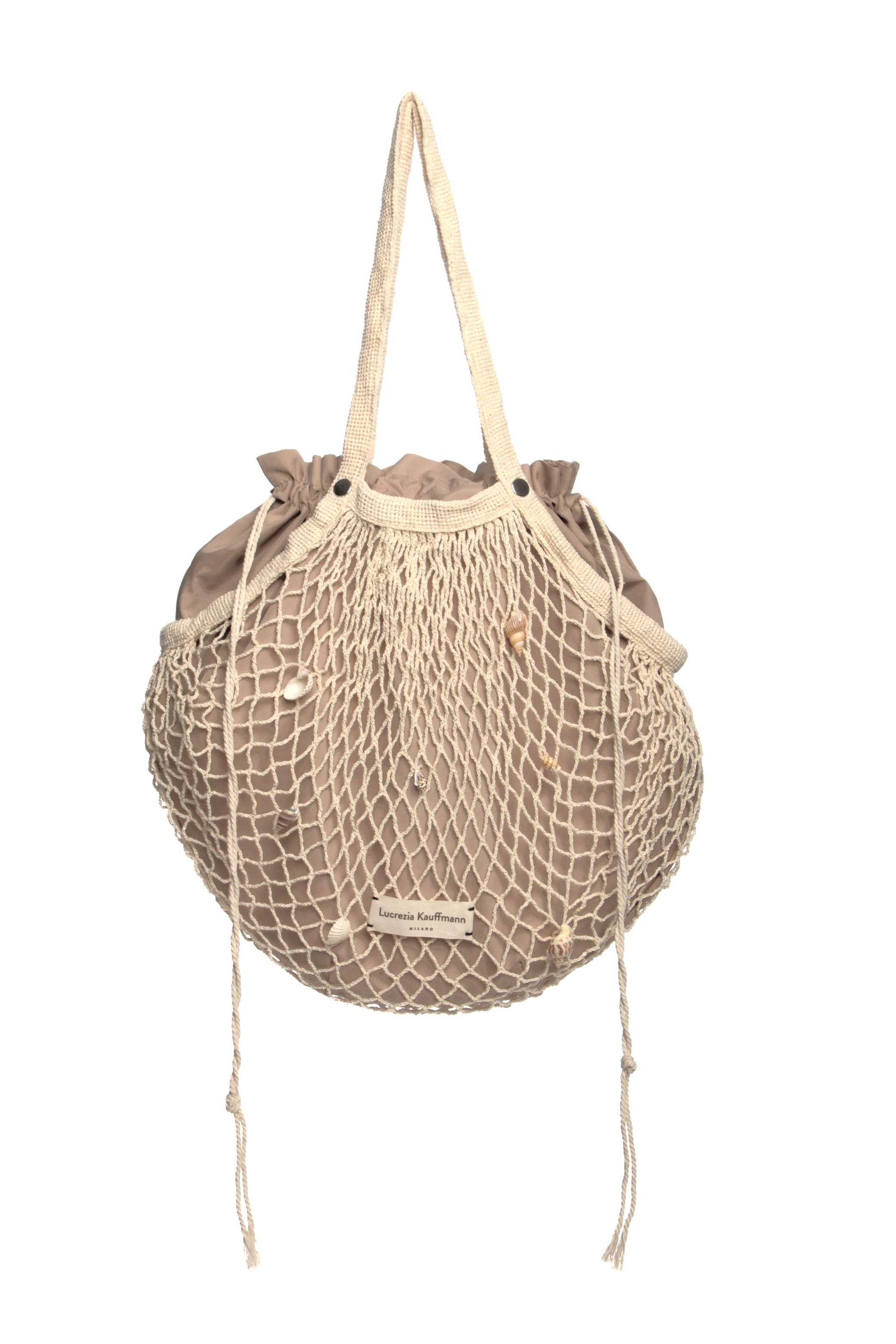 Its signature feature? 🐚 Natural seashells hand-stitched onto the net, each one different and applied at random—making every bag a truly unique, one-of-a-kind piece.