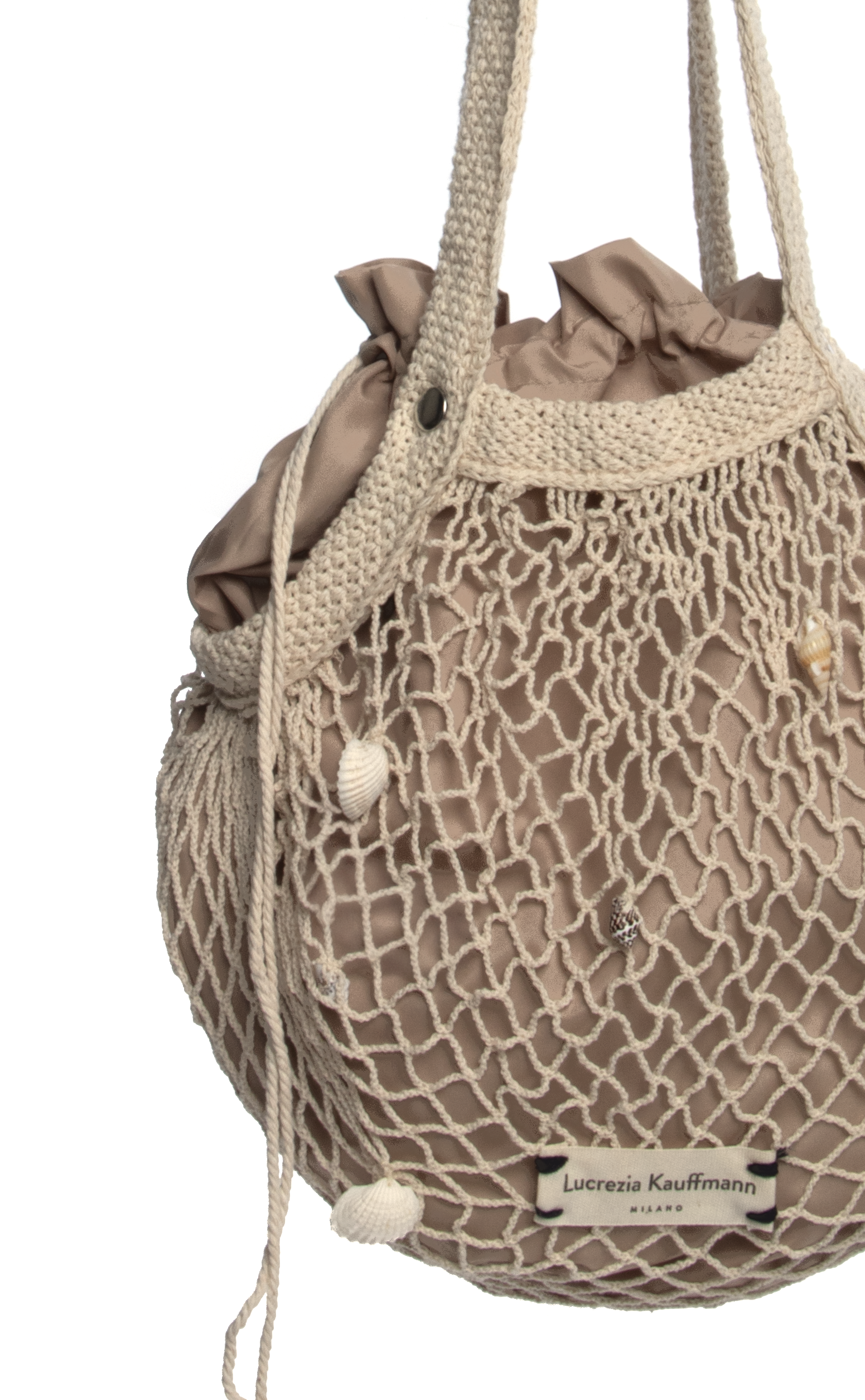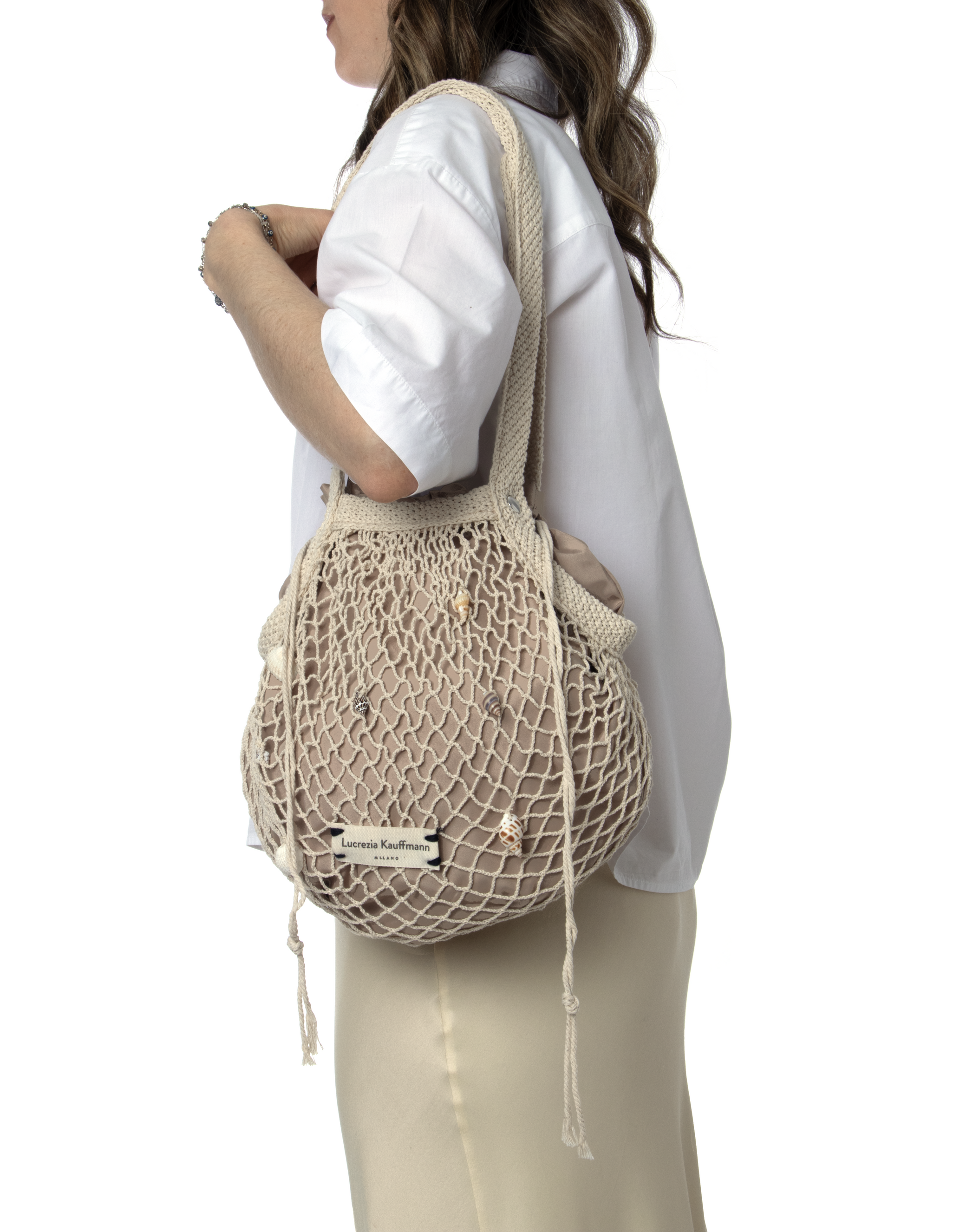 Its signature feature? 🐚 Natural seashells hand-stitched onto the net, each one different and applied at random—making every bag a truly unique, one-of-a-kind piece.
